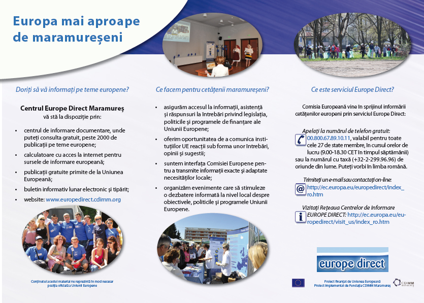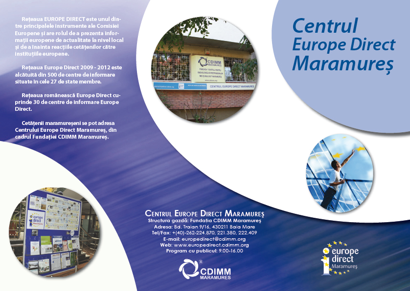 Centrul de informare Europe Direct Maramureș, găzduit de Fundația CDIMM Maramureș, în calitate de membru al Rețelei Europe Direct asigurăm accesul cetăţenilor maramureşeni la servicii specifice de informare şi comunicare pe teme europene.