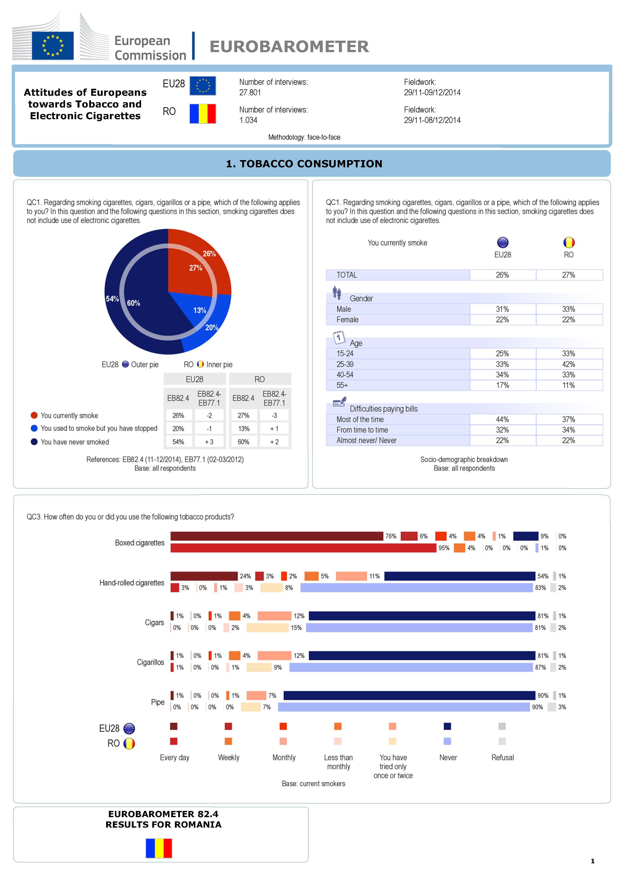 Potrivit celui mai recent studiu Eurobarometru, 27% dintre români fumează regulat (33% dintre bărbați și 22% dintre femei), procent în scădere cu 3% față de anul 2012 și aflat puțin peste media europeană de 26%. 95% din fumători folosesc zilnic pachetele de țigări preambalate (față de media UE de 76%), iar restul preferă țigările rulate (comparativ cu media europeană de 24%).