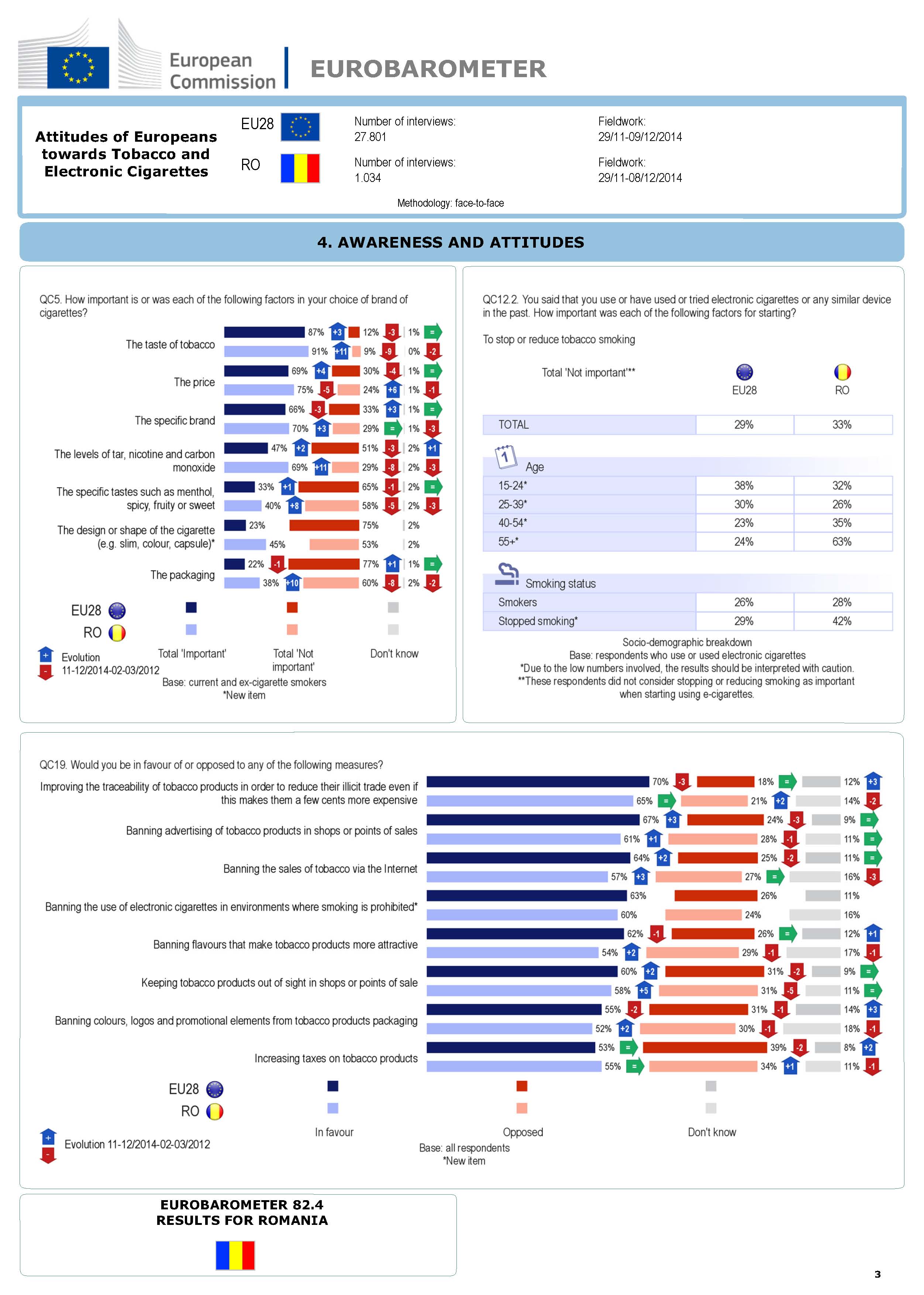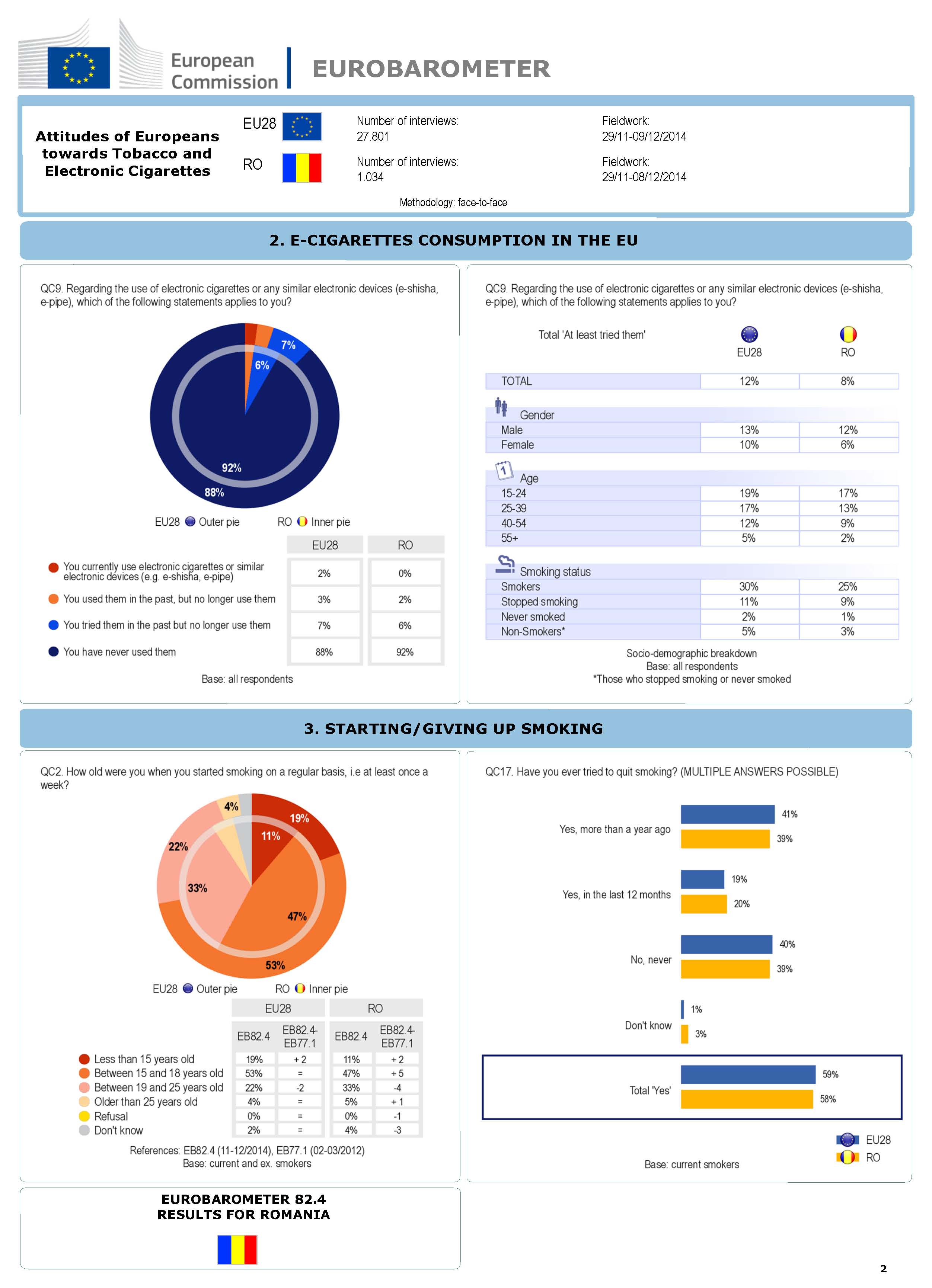 58% dintre români au încercat să se lase de fumat, procent apropiat de media europeană de 59%, iar dintre aceștia 20% în ultimul an. În ceea ce privește deprinderea fumatului, marea majoritate a celor ce încep să fumeze se încadrează în grupele de vârstă 15-18 ani (47%, procent în creștere cu 5 puncte) și 19-25 de ani (33%, procent în scădere cu 4 puncte). Pe ansamblul Uniunii, situația e similară, 53% dintre fumătorii începători situându-se în categoria de vârstă 15-18 ani, iar 22% în categoria 19-25 ani.