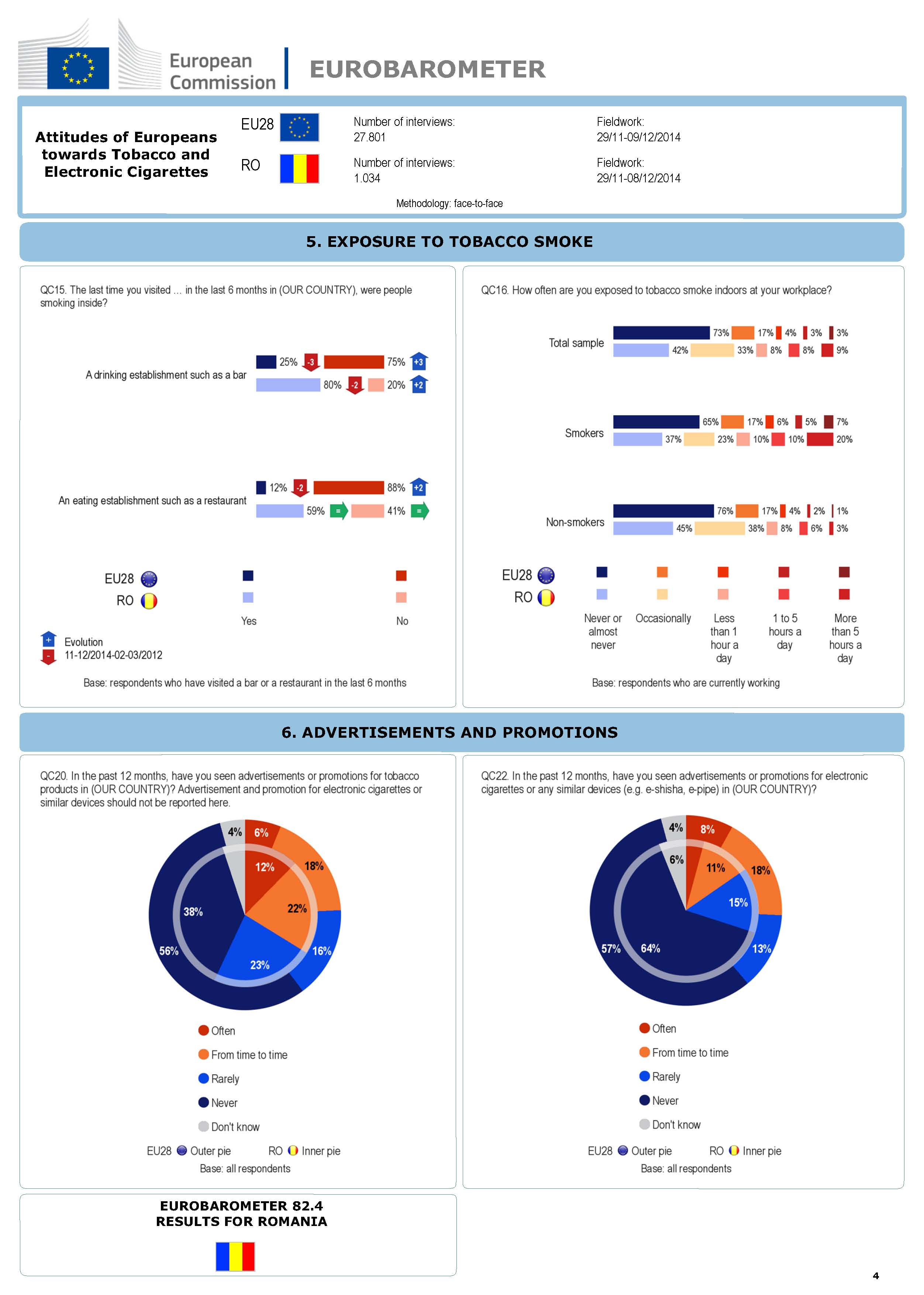 Nu mai puțin de 80% dintre barurile din România (procent în scădere cu 2 puncte) și 59% dintre restaurante (procent constant) permit fumatul în interior, față de o medie europeană de 25%, respectiv 12%.