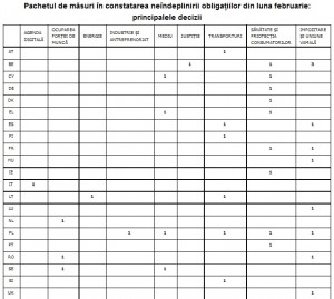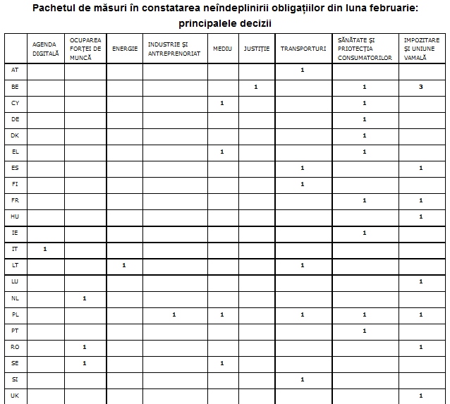 În cadrul pachetului lunar de decizii privind acțiunile în constatarea neîndeplinirii obligațiilor, Comisia Europeană inițiază acțiuni în justiție împotriva statelor membre care nu și-au îndeplinit în mod corespunzător obligațiile ce le revin în temeiul dreptului UE. Aceste decizii, care acoperă un număr mare de sectoare, vizează garantarea aplicării corecte a dreptului UE în beneficiul cetățenilor și al întreprinderilor. Comisia a adoptat 151 de decizii, între care 15 de avize motivate și 13 sesizări ale Curții de Justiție a Uniunii Europene, dintre care 2 includ sancțiuni financiare.