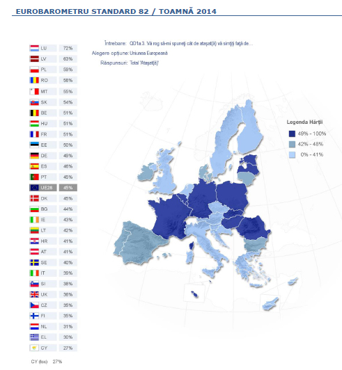- 60% dintre romani au încredere în Uniunea Europeană, procent mult superior celui referitor la instituțiile naționale. 68% dintre români se simt cetățeni europeni (în creștere față de 56% în 2013) și jumătate din cei intervievați consideră că își cunosc drepturile de cetățeni europeni.