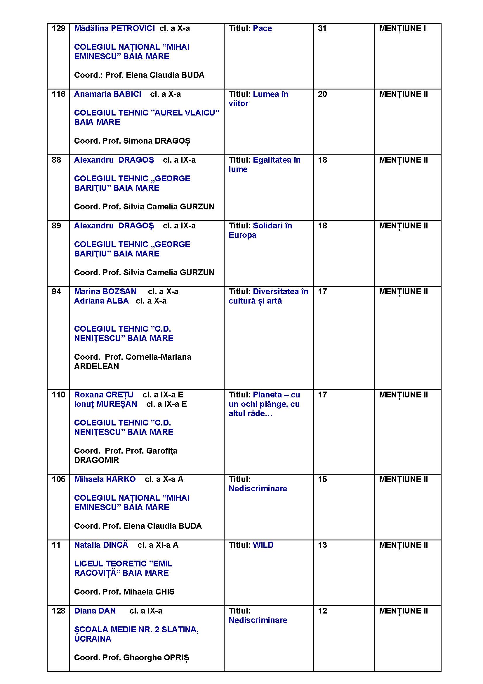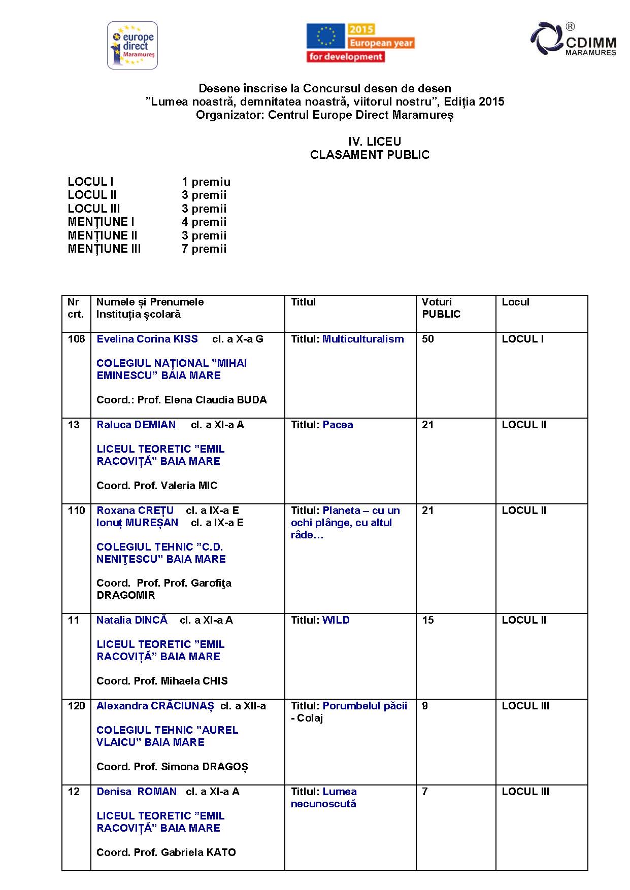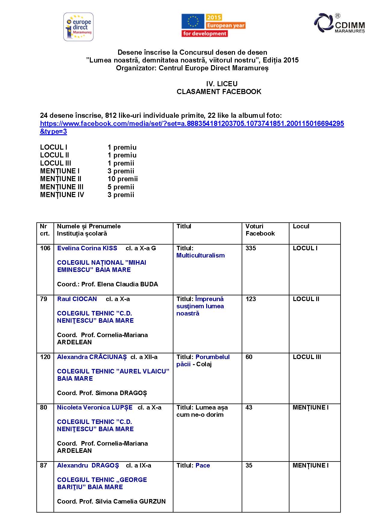 LICEU – Clasamentul Concursului de desen ”Lumea noastră, demnitatea noastră, viitorul nostru”